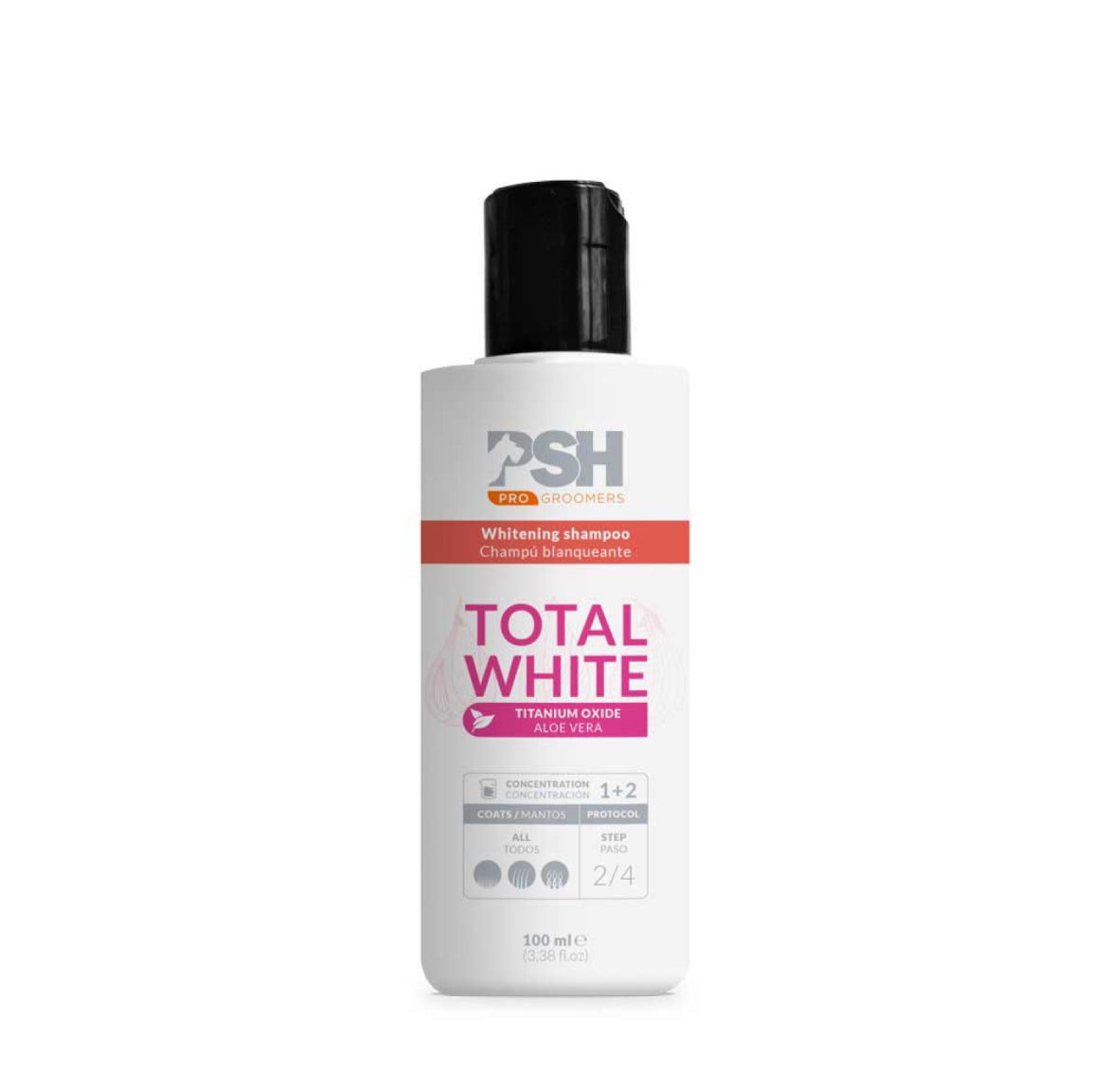 PSH Total White Pro Groomers šampūnas 100ml šunims yra specialus valomasis šampūnas, skirtas gražiam rezultatui ant balto kailio. Sugerdamas titano oksidą,nesausina odos, padeda pašviesinti kailį. Norint pasiekti geresnių rezultatų, rekomenduojama kelis kartus naudoti.
